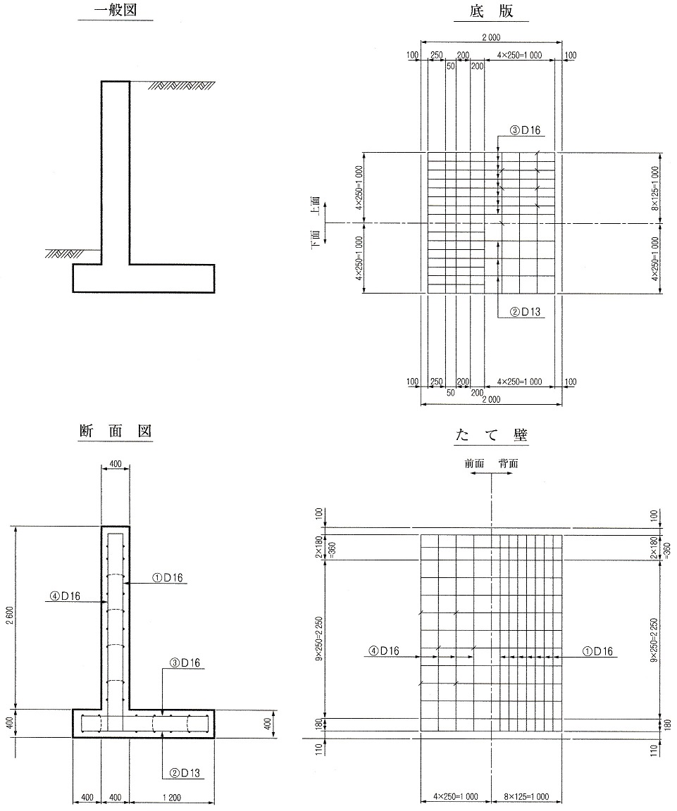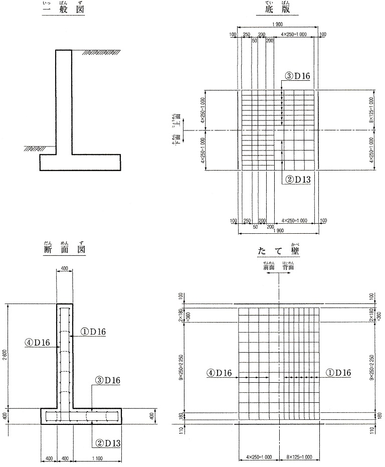 (2)材料の寸法表示等 ……………………………………………………………………………………………………… ▲▼▲▼▲▼▲▼▲▼▲▼▲▼▲▼ 問題 ▲▼▲▼▲▼▲▼▲▼▲▼▲▼▲▼▲▼▲ ……………………………………………………………………………………………………… 問1 擁壁 ……………… a, 下図は,擁壁の配筋図を示したものである。 かかと部の引張鉄筋に該当する鉄筋番号は,次のうちどれか。 (h29)(1)①D16 (2)②D13 (3)③D16 (4)④D16 b, 下図は,鉄筋コンクリートL型擁壁の配筋図を示したものである。たて壁とかかと版 の引張鉄筋の組合せで,正しいものはどれか。 (r3)