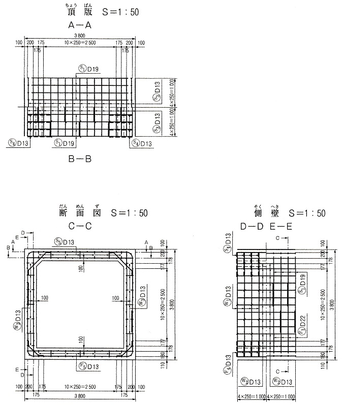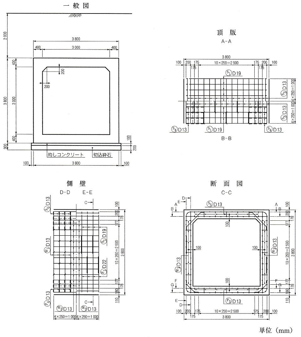 (1)ボックスカルバートの頂版の内側主鉄筋と側壁の内側主鉄筋の太さは,同じである。 (2)ボックスカルバートの頂版の土かぶりは,2.0 m である。 (3)頂版,側壁の主鉄筋は,ボックスカルバート延長方向に 250 mm 間隔で配置されてい る。 (4)ボックスカルバート部材の厚さは,ハンチの部分を除いて同じである。 ……………… b, 下図は,ボックスカルバートの配筋図を示したものである。この図における配筋に関 する次の記述のうち,適当でないものはどれか。 (r4)