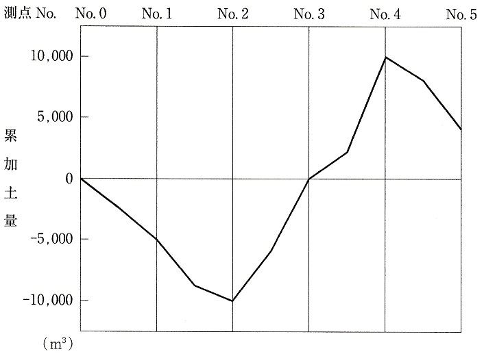 ……………… b, 下図は,工事起点No.0から工事終点No.5(工事区間延長500m)の道路改良工事の土積曲線 (マスカーブ)を示したものであるが,次の記述のうち,適当でないものはどれか。 (r2)