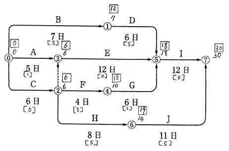 (1)クリティカルパスは,⓪→①→②→③→⑤→⑨である。 (2)作業Kの最早開始時刻は,工事開始後23日目である。 (3)工事開始⓪から工事完了⑨までの必要日数(工期)は30日である。 (4)作業Fが3日遅れると工期は当初工期より2日遅れる。 ……………………………………………………………………………………………………… ▲▼▲▼▲▼▲▼▲▼▲▼▲▼▲▼ 解答 ▲▼▲▼▲▼▲▼▲▼▲▼▲▼▲▼▲▼▲ ……………………………………………………………………………………………………… 問1 ……………… a, (2) 問題のネットワークの日程計算を行うと、次のようになる。