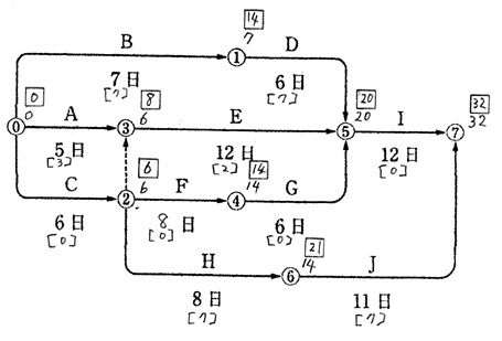 今度は、作業Fの日数を8日(4+4)にして日程計算を行うと、次のようになる。……………… b, (2) 問題のネットワークの日程計算を行うと、次のようになる。