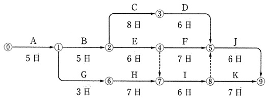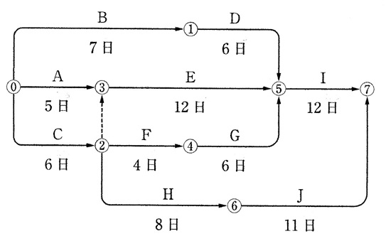 (3)ネットワーク手法 ……………………………………………………………………………………………………… ▲▼▲▼▲▼▲▼▲▼▲▼▲▼▲▼ 問題 ▲▼▲▼▲▼▲▼▲▼▲▼▲▼▲▼▲▼▲ ……………………………………………………………………………………………………… 問1 ネットワークの計算 ……………… a, 下図のネットワーク式工程表で示される工事で,作業Fに4日の遅延が発生した場合, 次の記述のうち,適当なものはどれか。 ただし,図中のイベント間のA~Jは作業内容,数字は作業日数を示す。 (r5)(1)当初の工期どおり完了する。 (2)当初の工期より2日遅れる。 (3)当初の工期より3日遅れる。 (4)クリティカルパスの経路は当初と変わらない。 ……………… b, 下図のネットワーク式工程表に関する次の記述のうち,適当でないものはどれか。 ただし,図中のイベント間のA~Kは作業内容,数字は作業日数を示す。 (r6)