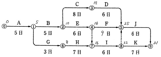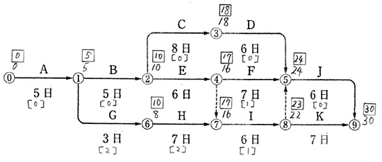 上図の工期は30日で、クリティカルパスは⓪→①→②→③→⑤→⑨である。 また、Kの最早開始時刻は、工事開始後22日目である。